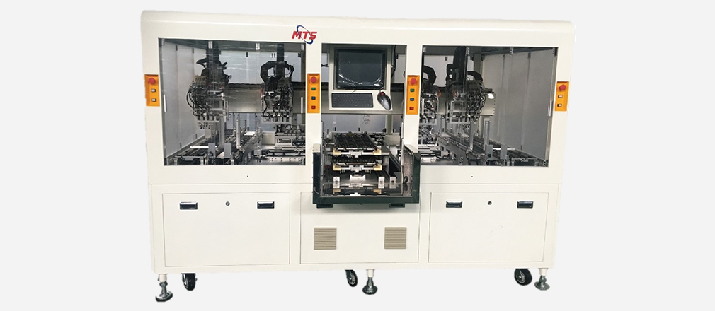 是我司自主研发、制造的高性能、高稳定性、高产出的平移式上下料设备。人工将装有IC的JEDEC Tray放入到设备里;另外将BIB板也放入到设备里。设备作业会有两种模式: 1、设备作业时会通过移载吸取模组,将IC从Tray上吸取,放置BIB板的Socket里。待BIB板里的Socket都放满IC后。人工取出BIB。2、将已完成测试的IC从BIB板上吸取,根据测试结果放置到OK或NG的Tray里。人工取出BIB或Tray。节省人力、避免人为导致的错误、提高产出。